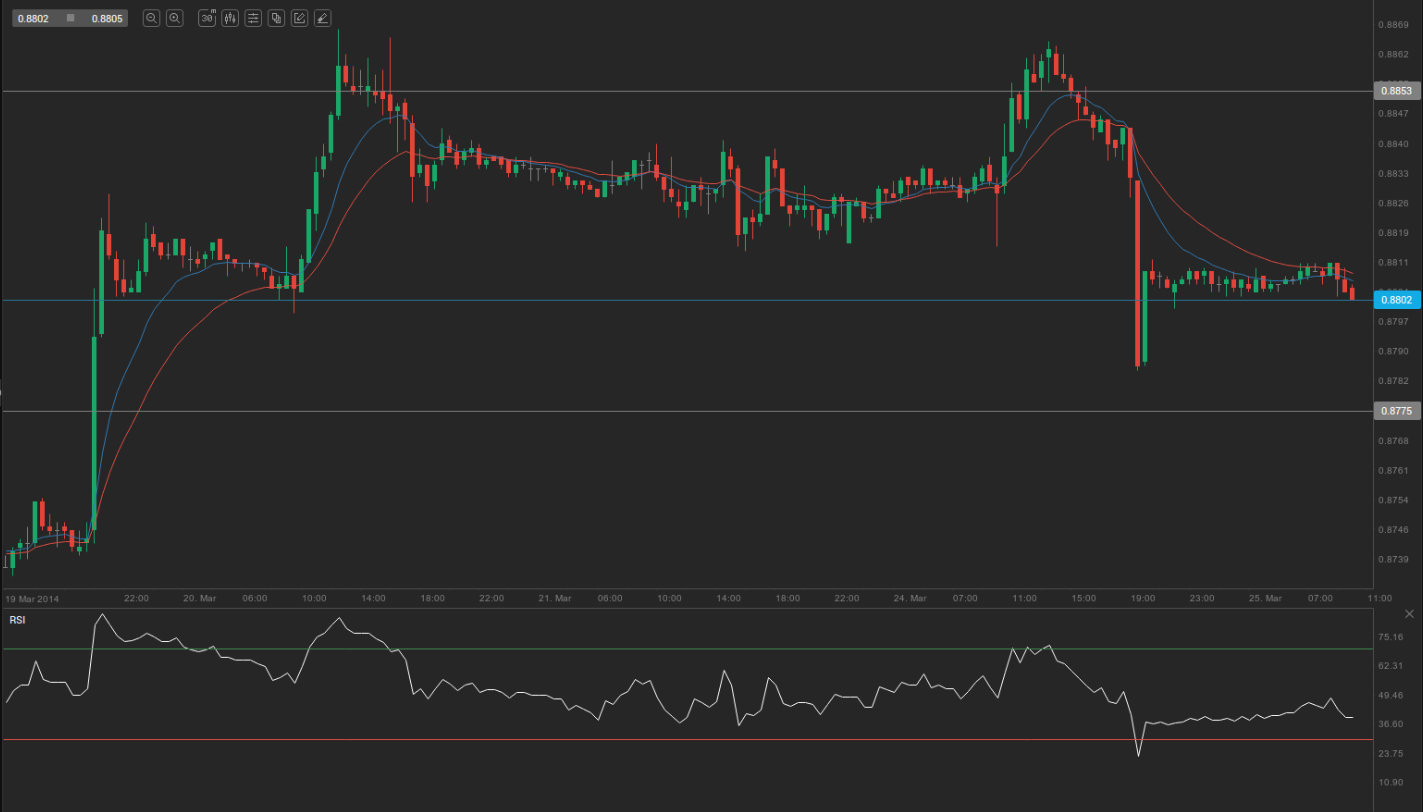 During yesterday’s trading session USD/CHF traded within the range of 0.8788-0.8866 and closed at 0.8808.