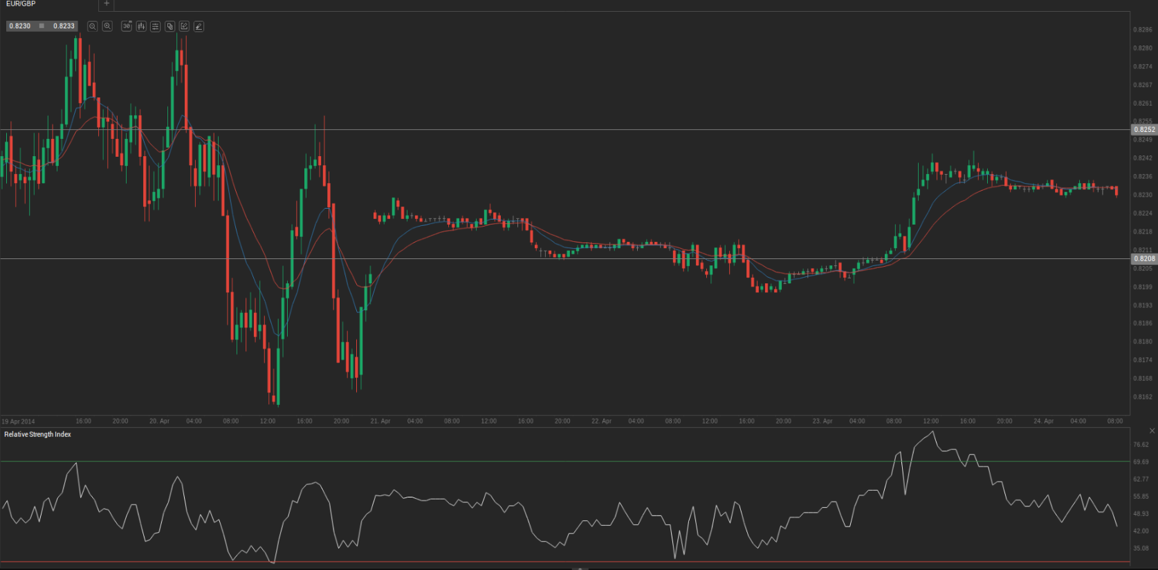 At 6:20 GMT today EUR/GBP was losing 0.04% for the day to trade at 0.8231. The pair touched a daily low at 0.8230 at 6:05 GMT.