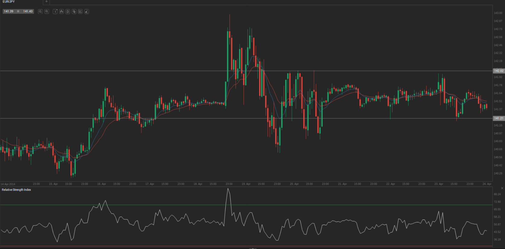 At 6:13 GMT today EUR/JPY was losing 0.19% for the day to trade at 141.41. The pair touched a daily low at 141.34 at 3:50 GMT.