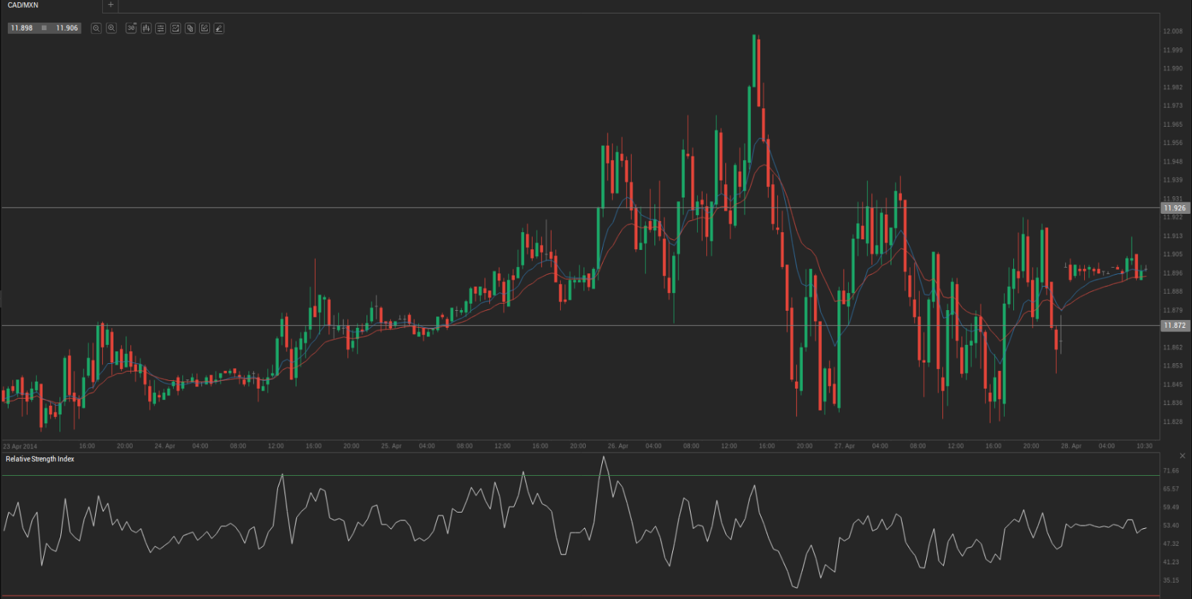 At 8:38 GMT today CAD/MXN was gaining 0.02% for the day to trade at 11.902. The pair touched a daily high at 11.916 at 7:20 GMT.