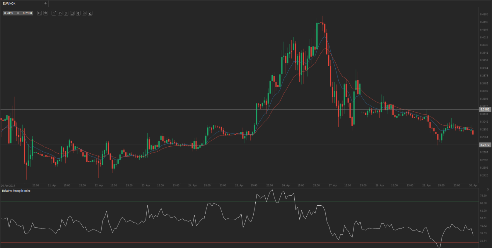 During yesterday’s trading session EUR/NOK traded within the range of 8.2786-8.3197 and closed at 8.2970.