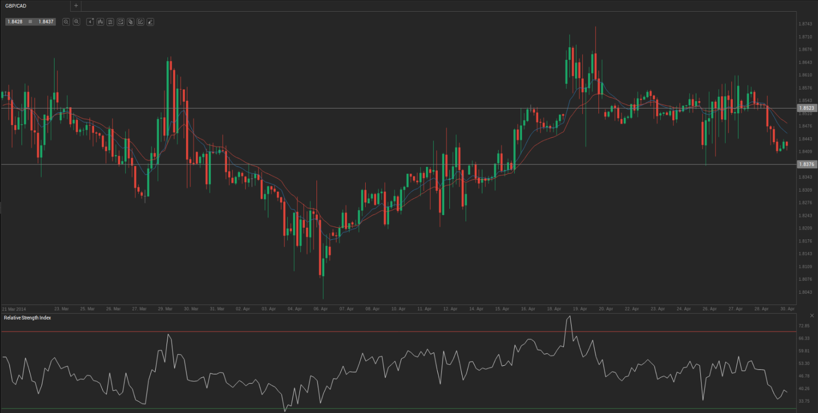 During yesterday’s trading session GBP/CAD traded within the range of 1.8415-1.8562 and closed at 1.8430.
