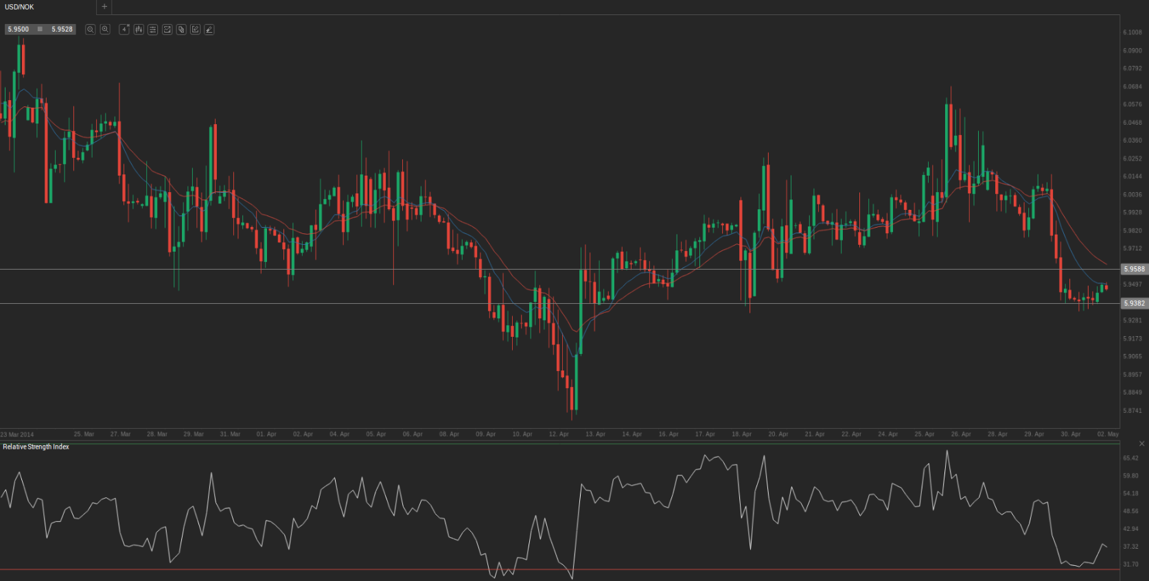 During yesterday’s trading session USD/NOK traded within the range of 5.9358-5.9503 and closed at 5.9466.