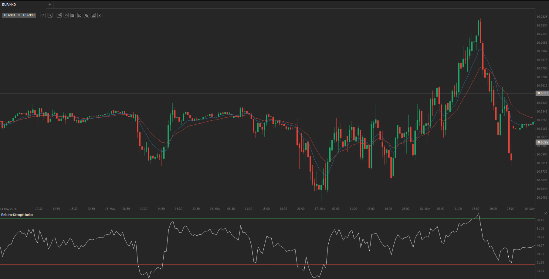 At 7:13 GMT today EUR/HKD was gaining 0.19% for the day to trade at 10.6350. The pair touched a daily high at 10.6369 at 7:07 GMT, breaching the first key resistance.