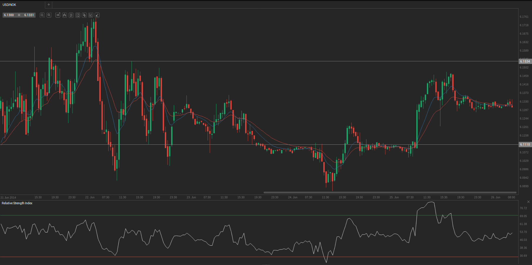 During yesterday’s trading session USD/NOK traded within the range of 6.1073-6.1495 and closed at 6.1341.