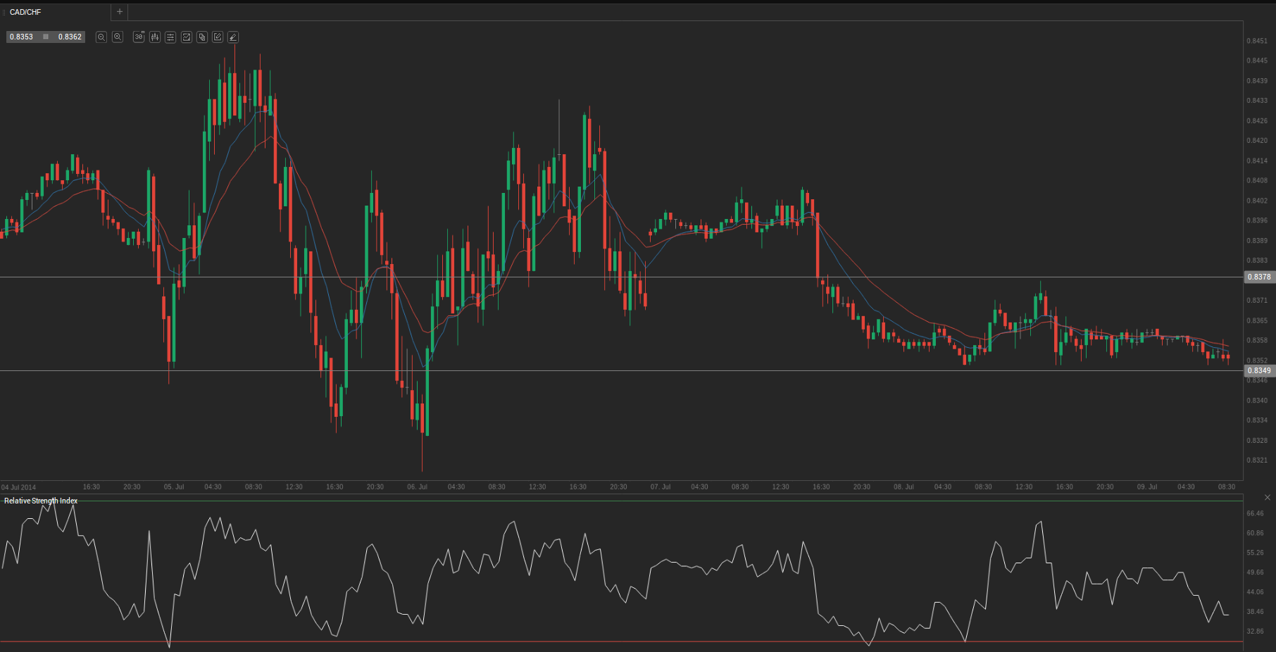 At 6:36 GMT today CAD/CHF was losing 0.07% for the day to trade at 0.8357. The pair touched a daily low at 0.8356 at 6:35 GMT.