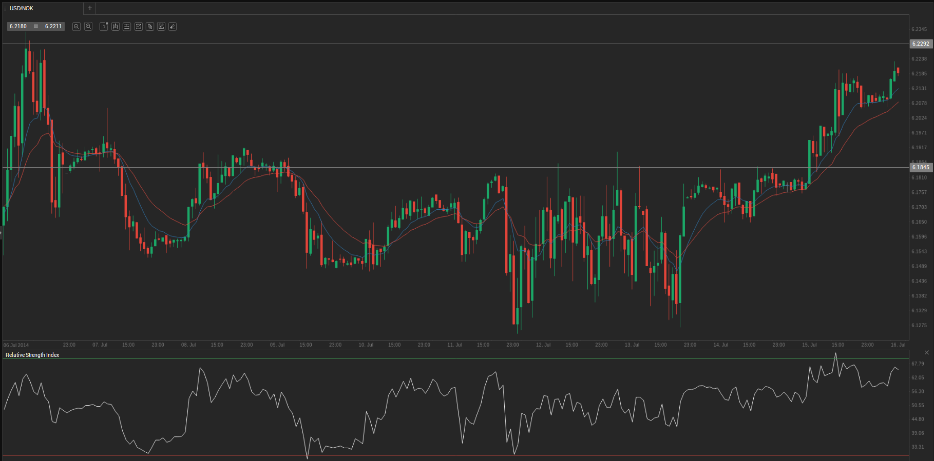 During yesterday’s trading session USD/NOK traded within the range of 6.1767-6.2215 and closed at 6.2108.