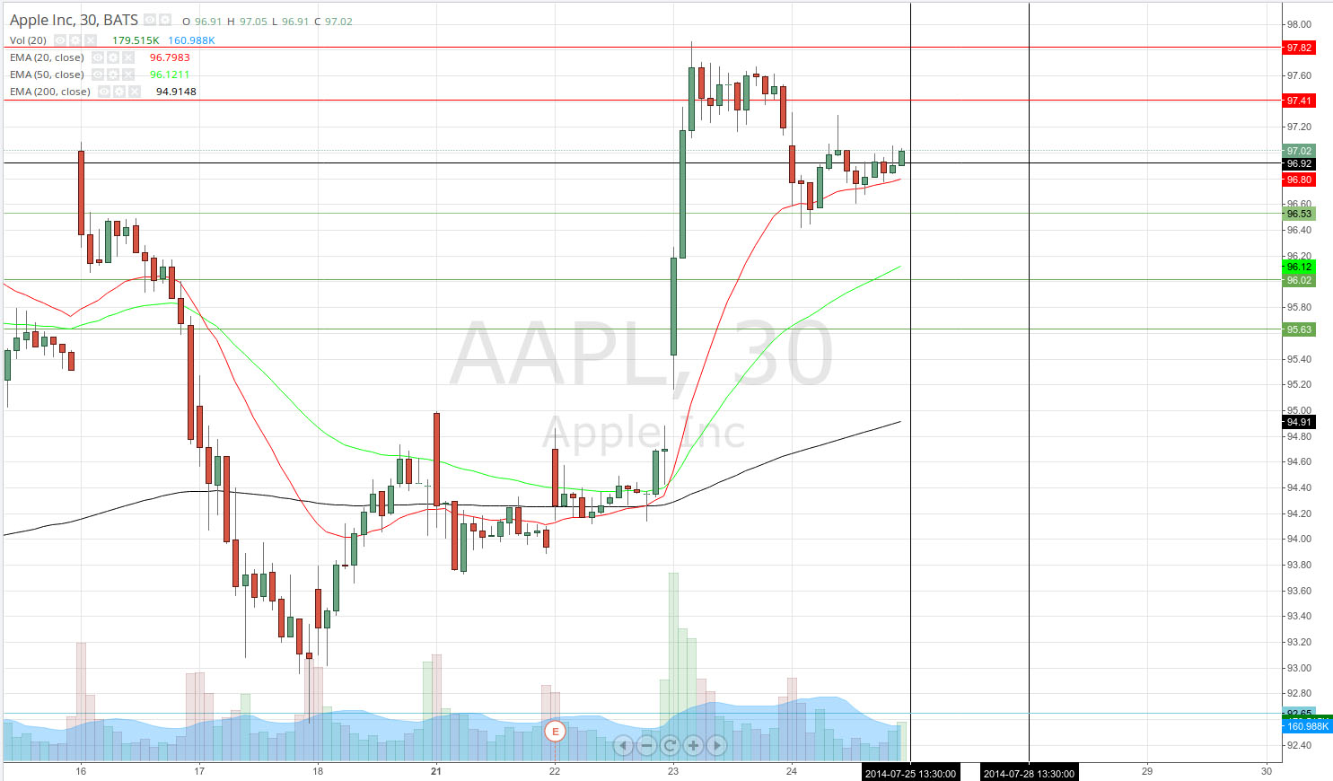 Dropping down to the 30-minute chart, we see a possible sign of a bullish breakout from the aforementioned rectangle formation. After gapping up on July 23rd, the market moved to form what could possibly be a bull flag continuation pattern. Following the gap up and the three climactic bull trend bars up, Apple entered a consolidation area near the 20-period EMA and closed higher on July 24th.