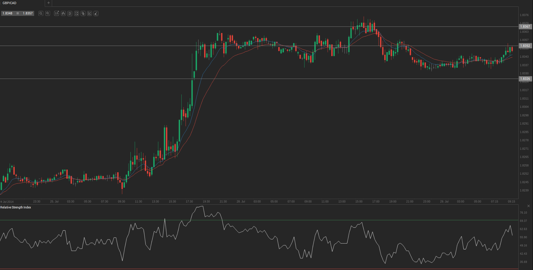At 6:48 GMT today GBP/CAD was gaining 0.08% for the day to trade at 1.8354. The pair touched a daily high at 1.8359 at 6:20 GMT.