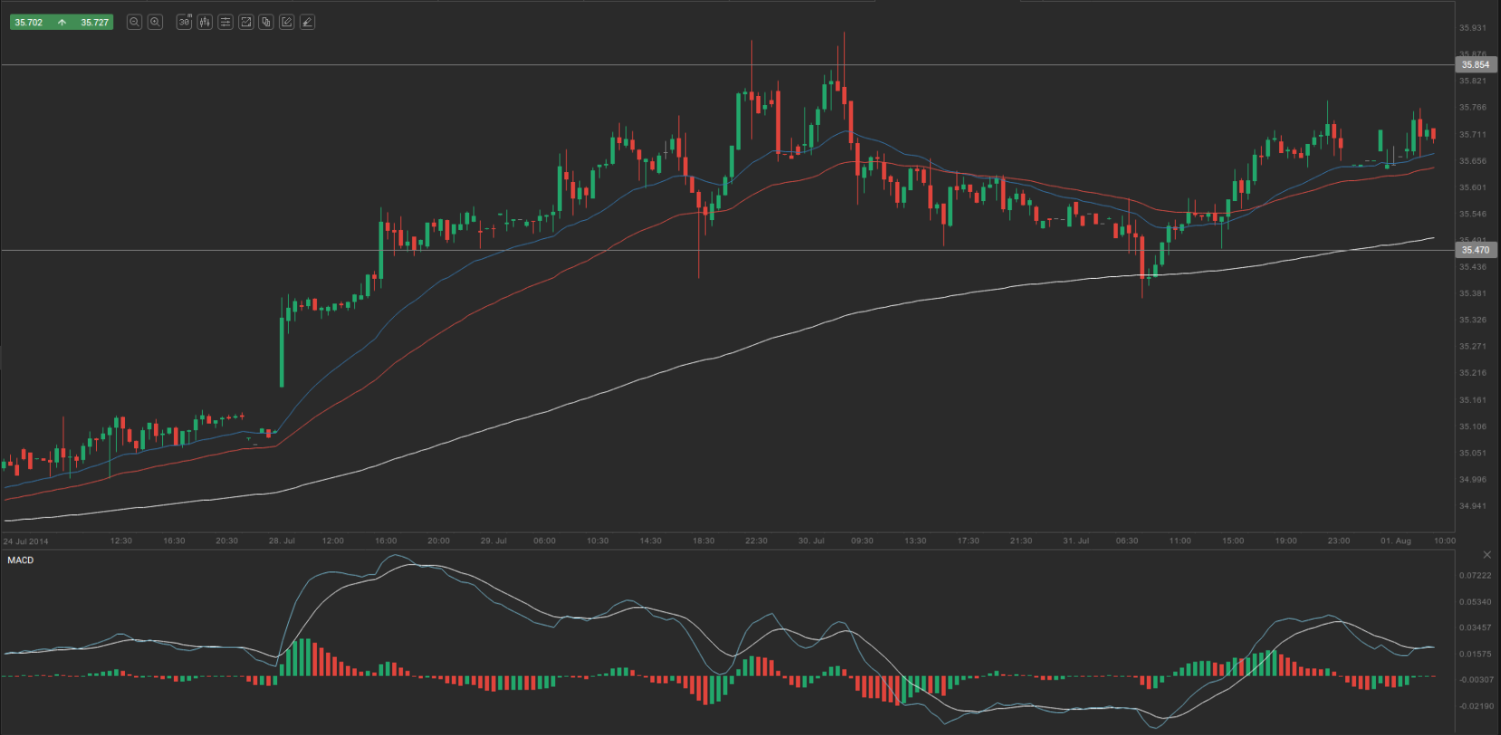 According to Binary Tribune’s daily analysis, the central pivot point for the pair is at 35.6323. In case USD/RUB manages to breach the first resistance level at 35.8547, it will probably continue up to test 36.0153. In case the second key resistance is broken, the pair will probably attempt to advance to 36.2377.