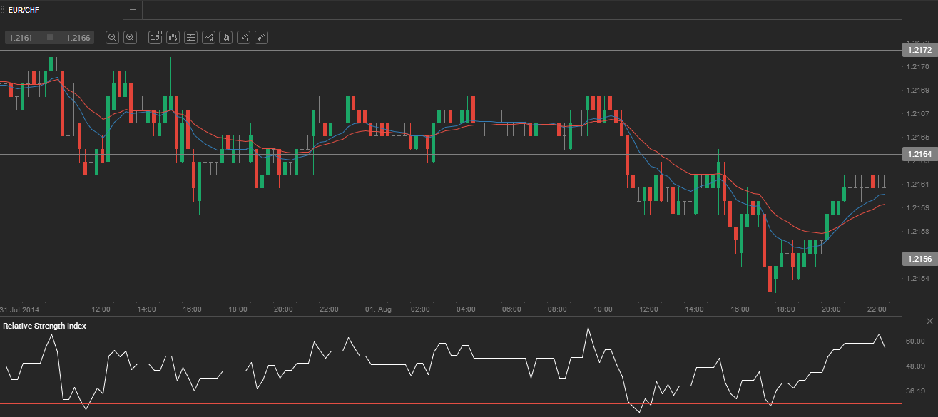During Friday’s trading session EUR/CHF traded within the range of 1.2155-1.2171 and closed at 1.2165, losing 0.03% for the day, but gaining 0.12% on a weekly basis.
