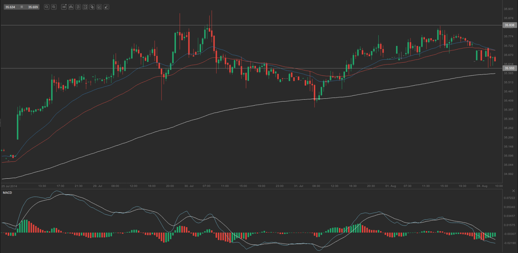 According to Binary Tribune’s daily analysis, the central pivot point for the pair is at 35.758. In case USD/RUB manages to breach the first resistance level at 35.838, it will probably continue up to test 35.923. In case the second key resistance is broken, the pair will probably attempt to advance to 36.003.