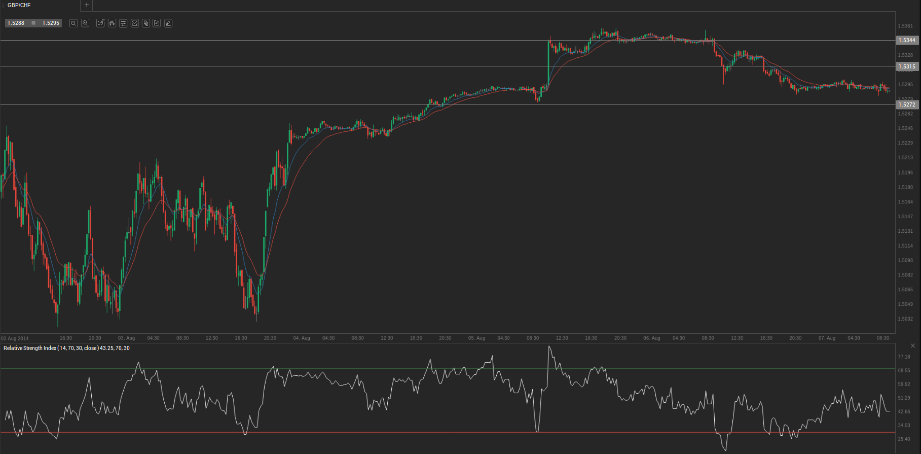 At 7:15 GMT today GBP/CHF was losing 0.01% for the day to trade at 1.5292. The pair touched a daily low at 1.5286 at 5:50 GMT.