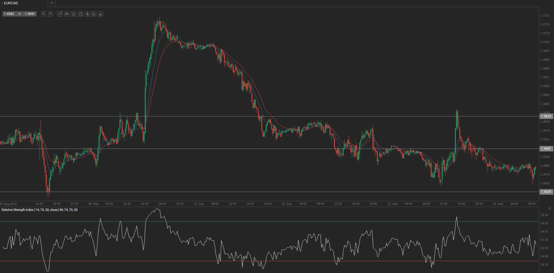 At 6:45 GMT today EUR/CAD was gaining 0.02% for the day to trade at 1.4588. The pair touched a daily high at 1.4593 at 3:45 GMT.