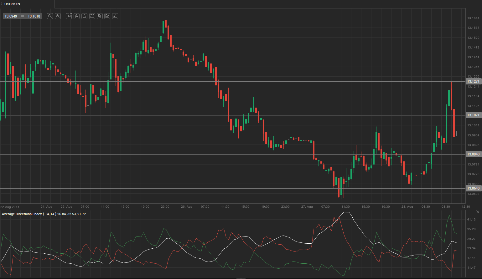 At 11:37 GMT today USD/MXN was up 0.13% for the day to trade at 13.1014. The pair held in a daily range between 13.0691 and 13.1310.