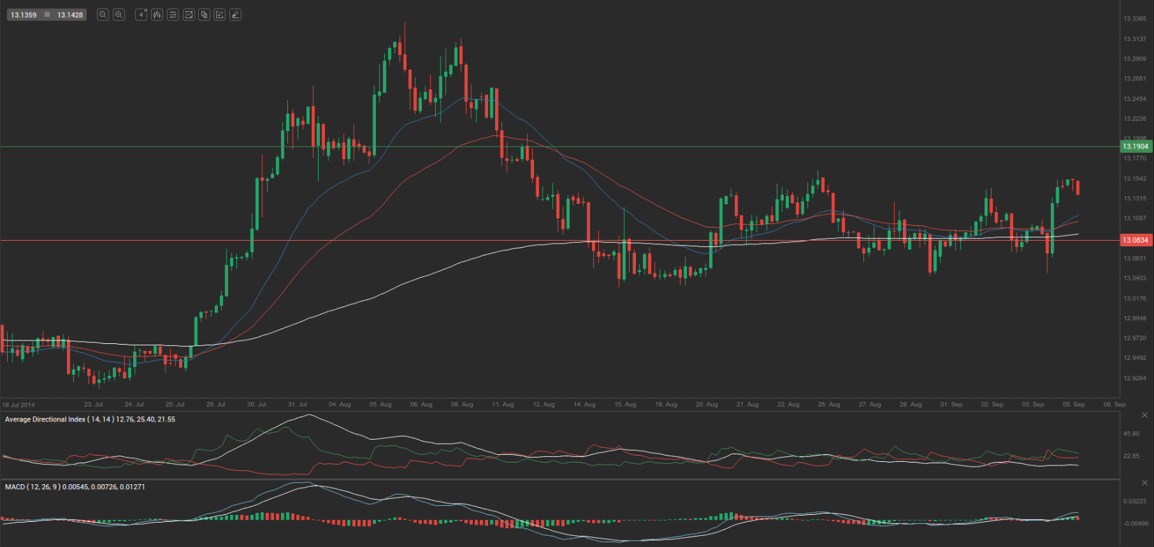 Yesterday’s trade saw USD/MXN within the range of 13.0494-13.1564. The pair closed at 13.1538, gaining 0.38% on a daily basis.