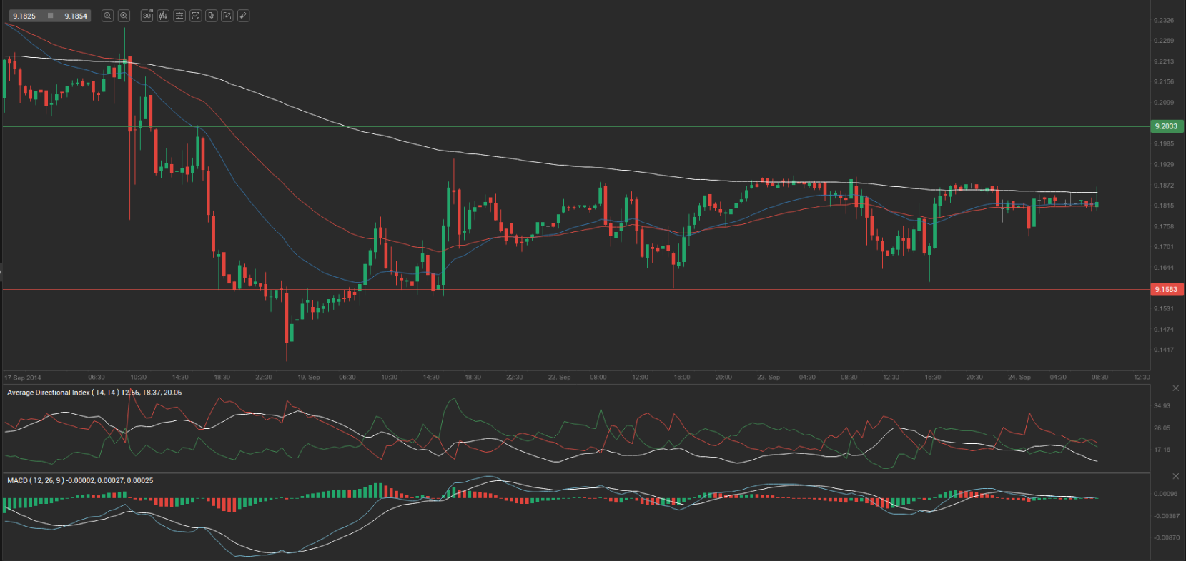 Yesterday’s trade saw EUR/SEK within the range of 9.1531-9.1980. The pair closed at 9.1834, losing 0.08% on a daily basis.