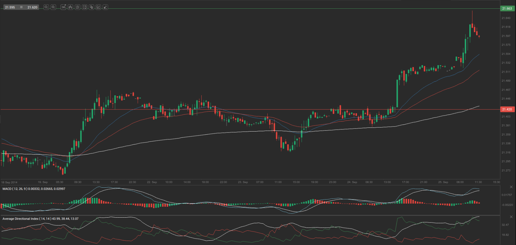In weekly terms, the central pivot point is at 21.3687. The three key resistance levels are as follows: R1 – 21.5813, R2 – 21.6957, R3 – 21.9083. The three key support levels are: S1 – 21.2543, S2 – 21.0417, S3 – 20.9273.