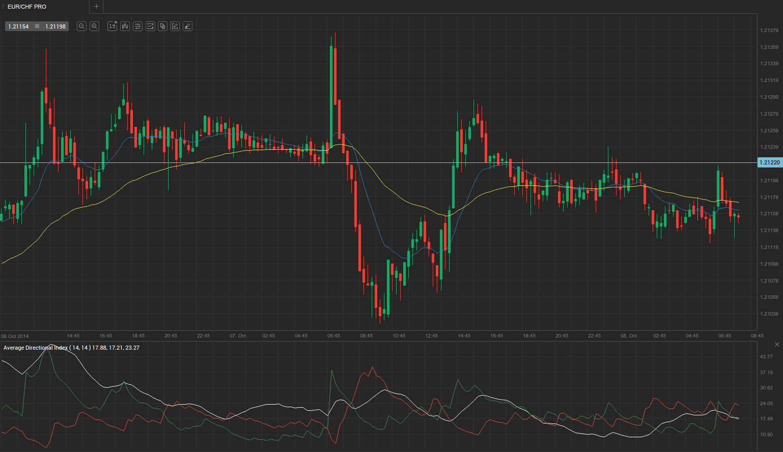 At 8:07 GMT today EUR/CHF was down 0.03% for the day to trade at 1.2118. The pair held in a daily range between 1.2114 and 1.2126.