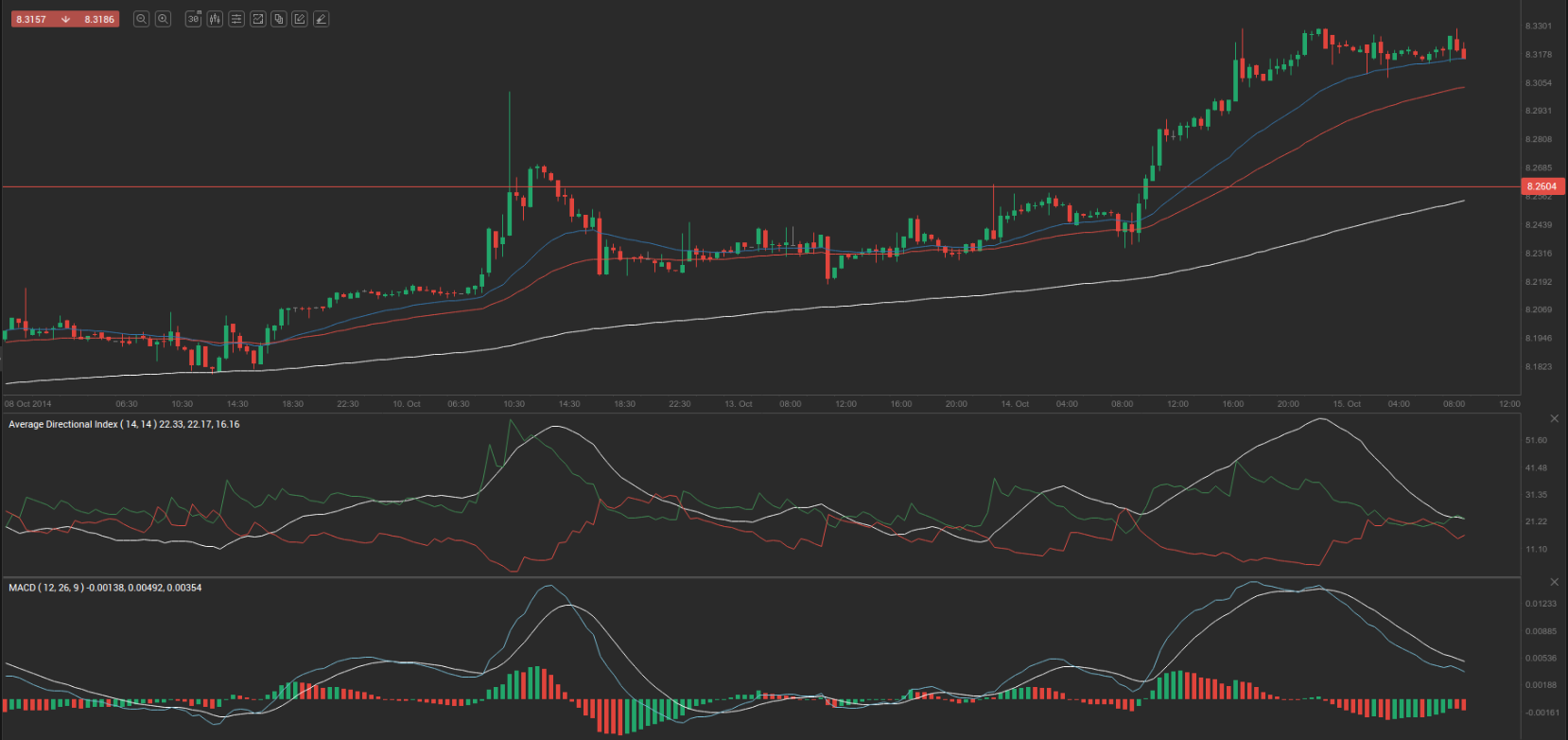 In weekly terms, the central pivot point is at 8.2202. The three key resistance levels are as follows: R1 – 8.2889, R2 – 8.3572, R3 – 8.4259. The three key support levels are: S1 – 8.1519, S2 – 8.0832, S3 – 8.0149.