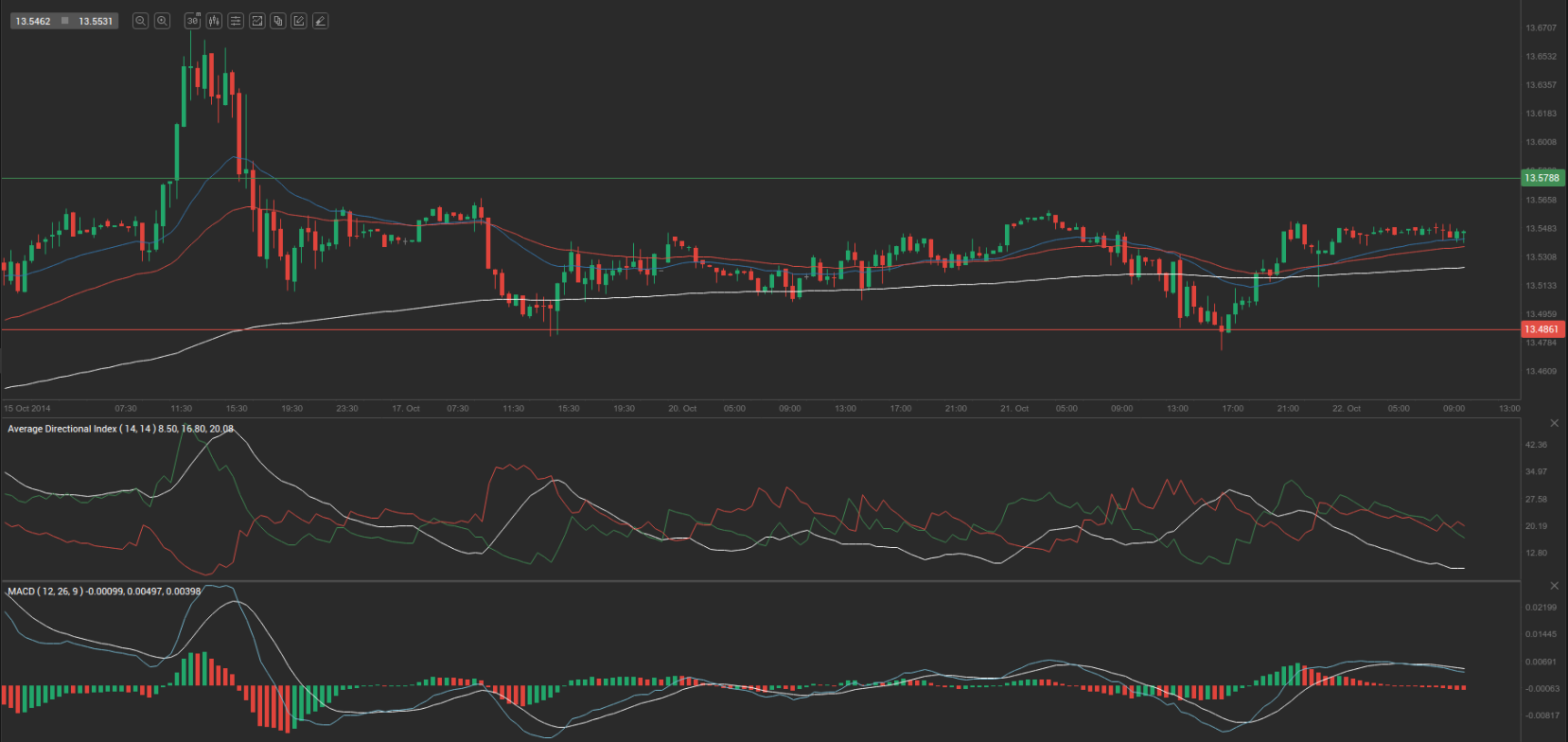 Yesterday’s trade saw USD/MXN within the range of 13.4720-13.5647. The pair closed at 13.5395, gaining 0.04% on a daily basis.