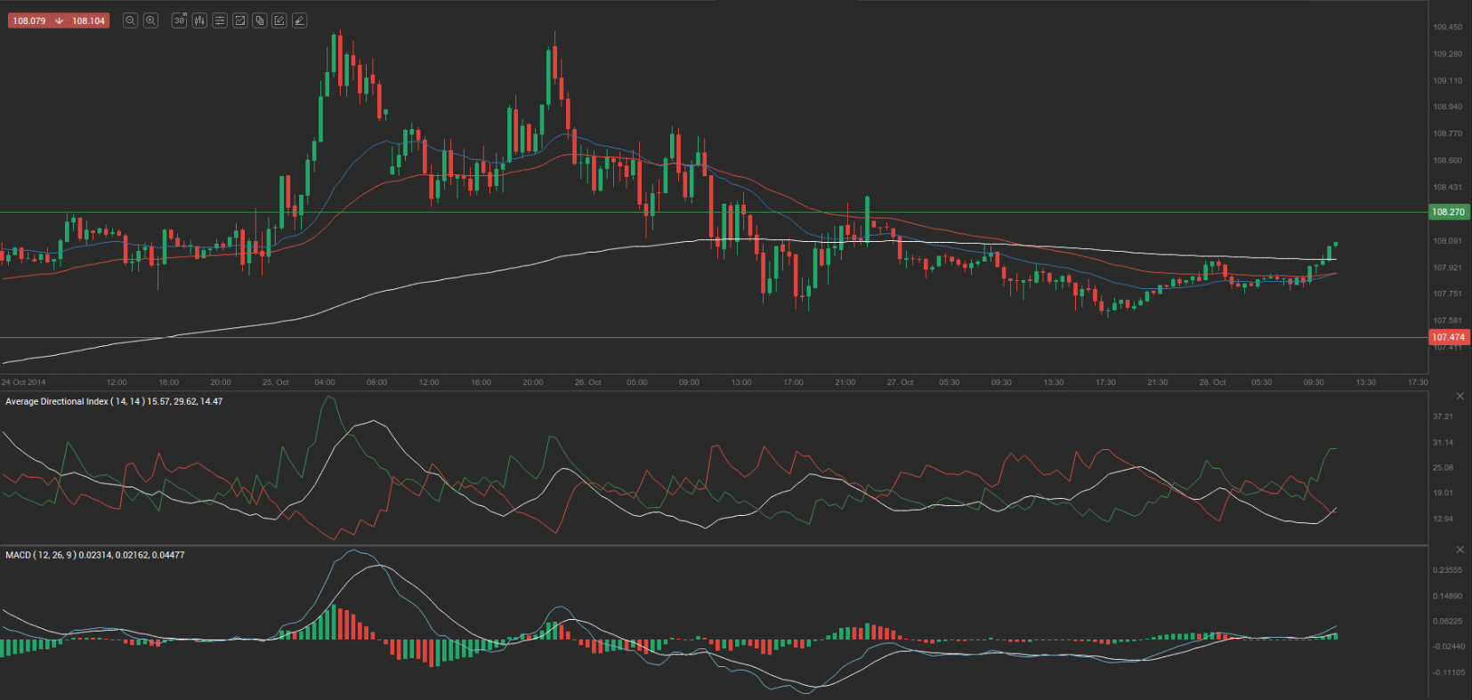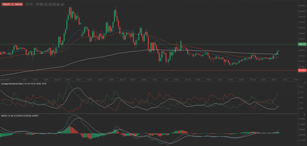 Yesterday’s trade saw USD/JPY within the range of 107.58-108.38. The pair closed at 107.81, losing 0.34% on a daily basis.