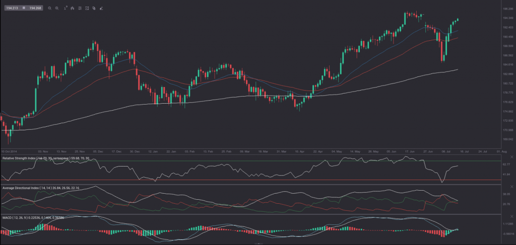 Yesterday’s trade saw GBP/JPY within the range of 193.04-193.94. The pair closed at 193.85, up 0.11% on a daily basis, while marking a fourth consecutive trading day of gains. The daily rate of increase has been the most modest one since June 25th, when GBP/JPY added 0.08%. In addition, the daily high has also been the highest level since June 26th, when the cross registered a high of 195.28.