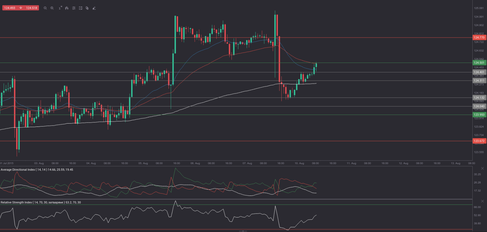 R3 (range resistance – green on the 1-hour chart) – 124.50
