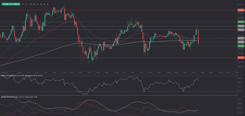 At 14:44 GMT today GBP/JPY was up 0.07% for the day to trade at 194.40. The pair touched a daily high at 194.54 at 14:20 GMT.