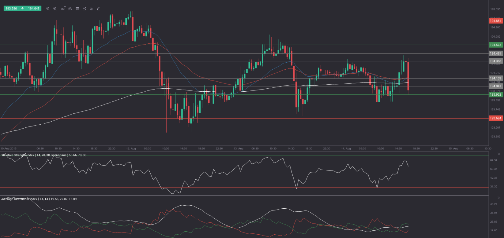 Yesterday’s trade saw GBP/JPY within the range of 193.63-194.78. The pair closed at 194.25, surging 0.16% on a daily basis, or the smallest daily gain since August 4th, when it added 0.13%. On August 12th the cross went up as high as 195.06, or the highest level since August 6th, when a daily high of 195.28 was recorded.