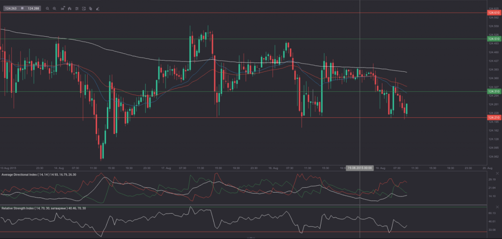 At 7:40 GMT today USD/JPY was down 0.12% for the day to trade at 124.25. The pair tested the lower range breakout level (S4), as it touched a daily low at 124.21 at 7:26 GMT.