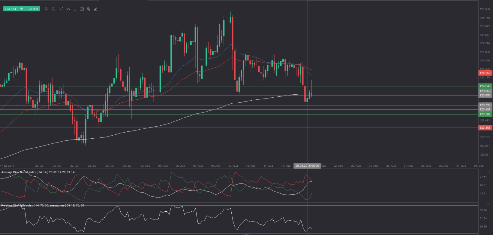 Yesterday’s trade saw USD/JPY within the range of 123.68-124.50. The pair closed at 123.81, down 0.48% on a daily basis, or the first loss in the past three trading days. The daily rate of decrease has been the sharpest one since August 12th, when the cross slid 0.74%. The daily low has been the lowest level since July 31st, when the cross registered a low of 123.50.