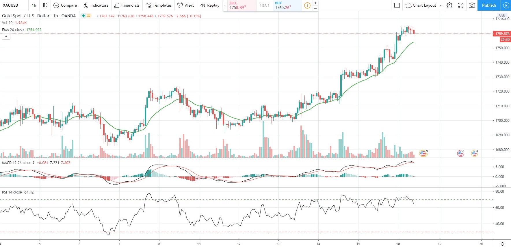 At 9:29 GMT Spot Gold was gaining 1.01% to $1,760.20 per troy ounce, after touching an intraday high of $1,765.09, or a price level not seen since October 12th 2012 ($1,773.39). Meanwhile, Gold futures for delivery in June were gaining 0.74% on the day to trade at $1,769.35 per troy ounce, while Silver futures for delivery in July were up 3.53% to trade at $17.672 per troy ounce.