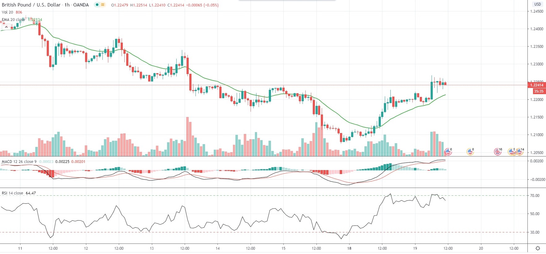 As of 11:07 GMT on Tuesday GBP/USD was gaining 0.44% to trade at 1.2249, after touching an intraday high of 1.2268, or a level not seen since May 13th (1.2340).