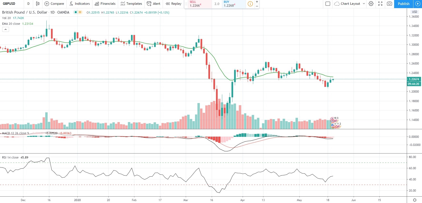 The larger time frame clearly visualizes that the major pair has been moving within a wide trading range since late March, with the upper limit being around April 14th high of 1.2648 and the lower limit being around May 18th low of 1.2076.