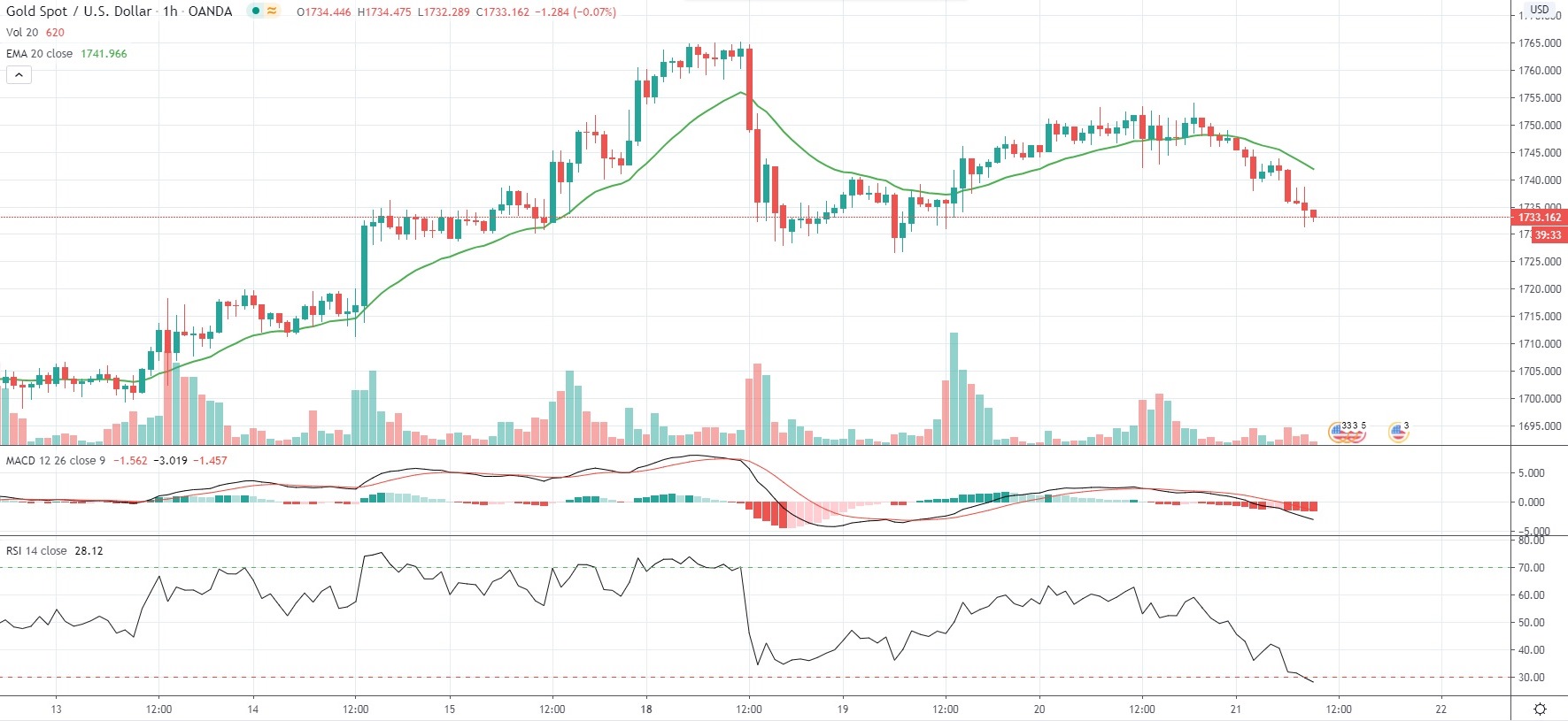 At 9:32 GMT today Spot Gold was losing 0.80% to trade at $1,734.14 per troy ounce, after touching an intraday low of $1,731.43, or a price level not seen since May 19th ($1,726.62). Meanwhile, Gold futures for delivery in June were losing 0.96% on the day to trade at $1,735.30 per troy ounce, while Silver futures for delivery in July were down 1.93% to trade at $17.683 per troy ounce.