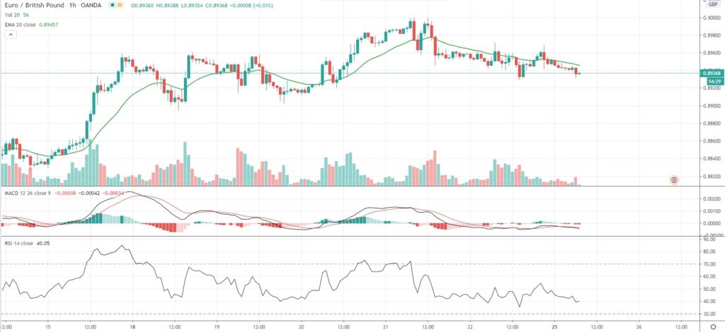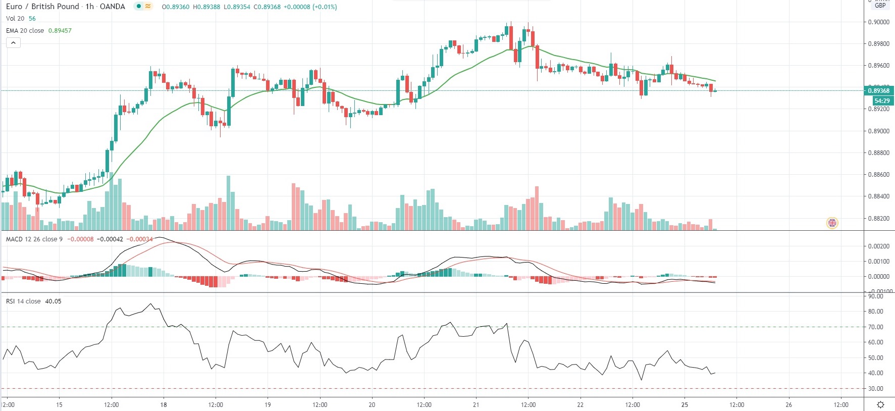 As of 7:10 GMT on Monday EUR/GBP was losing 0.27% to trade at 0.8936, after touching an intraday low of 0.8931 during the early phase of the European session on light volume.