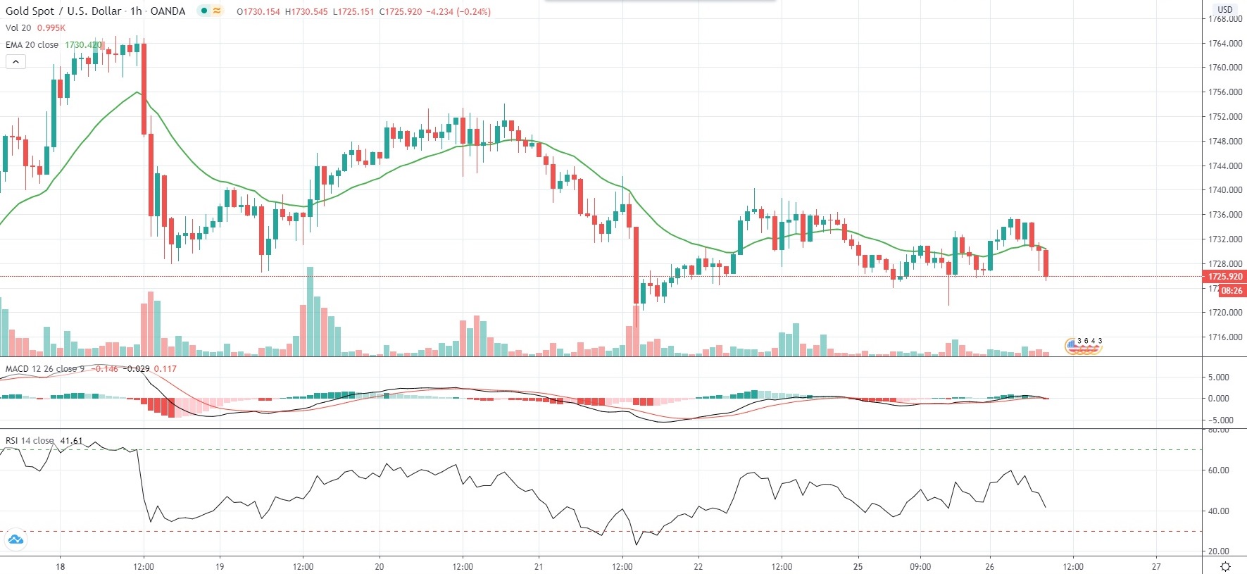 At 9:42 GMT today Spot Gold was retreating 0.32% to trade at $1,723.78 per troy ounce, after touching an intraday low of $1,722.10, not far from the low recorded on Monday. Meanwhile, Gold futures for delivery in June were losing 0.76% on the day to trade at $1,722.35 per troy ounce, while Silver futures for delivery in July were up 0.81% to trade at $17.837 per troy ounce.