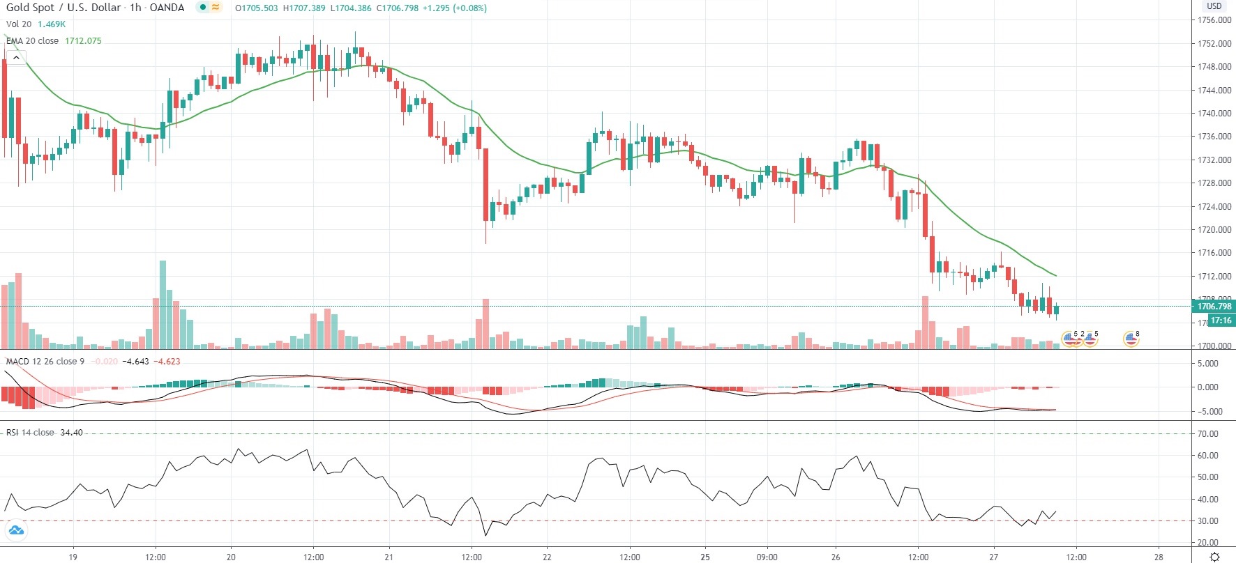 At 9:42 GMT today Spot Gold was retreating 0.24% to trade at $1,706.96 per troy ounce, after touching an intraday low of $1,704.39, or a price level not seen since May 13th ($1,699.26). Meanwhile, Gold futures for delivery in June were losing 0.50% on the day to trade at $1,696.90 per troy ounce, while Silver futures for delivery in July were down 0.01% to trade at $17.593 per troy ounce.
