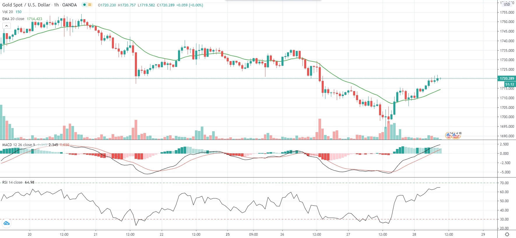 At 9:30 GMT today Spot Gold was gaining 0.68% to trade at $1,721.11 per troy ounce, after touching an intraday high of $1,722.56, or a price level not seen since May 26th ($1,735.58). Meanwhile, Gold futures for delivery in June were gaining 0.56% on the day to trade at $1,720.35 per troy ounce, while Silver futures for delivery in July were up 0.93% to trade at $17.922 per troy ounce.