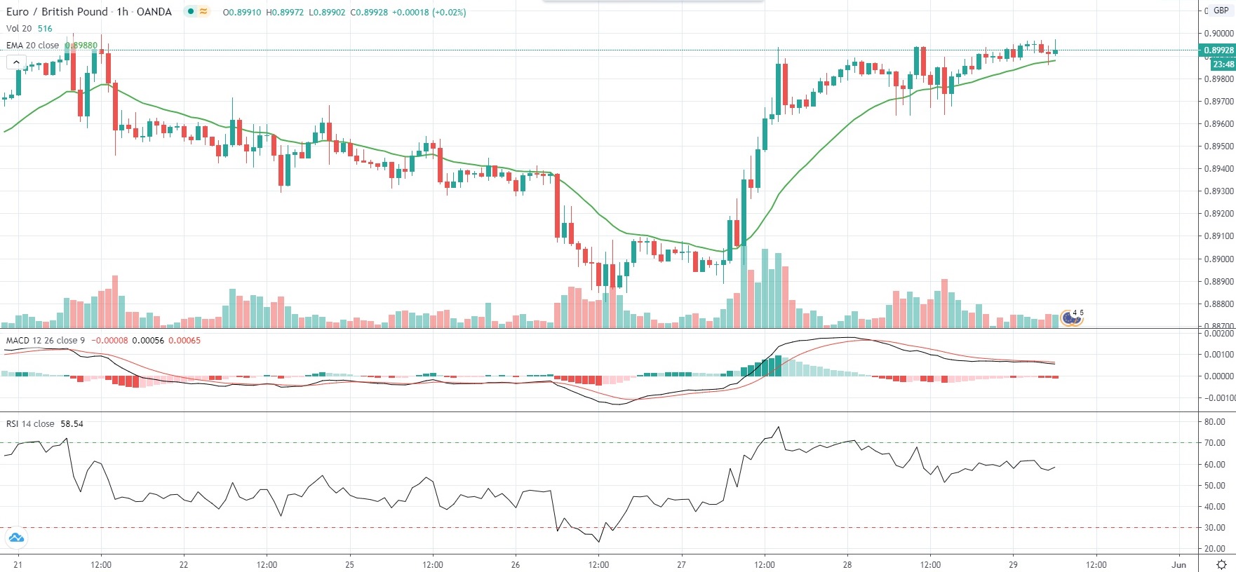 As of 6:37 GMT on Friday EUR/GBP was inching up 0.04% to trade at 0.89931, after touching an intraday high of 0.89972 during the late phase of the Asian session. The latter has been a level not seen since May 21st (0.90002).