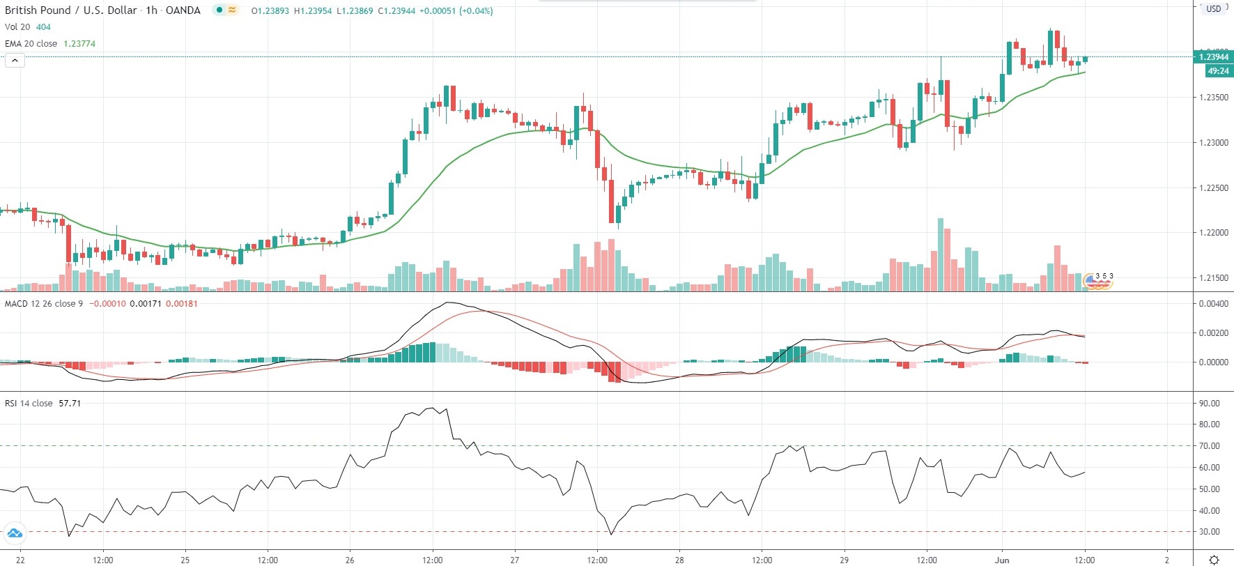 As of 12:12 GMT on Monday GBP/USD was gaining 0.37% to trade at 1.2396, after touching an intraday high of 1.2426 during early European trade. It has been a level not seen since May 11th, when the major pair registered a high of 1.2438.