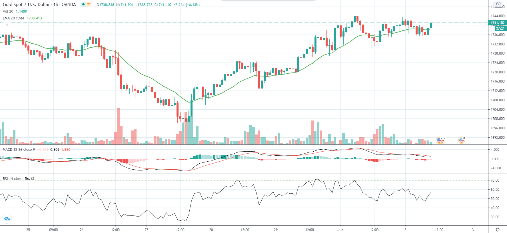 Meanwhile, concerns that the COVID-19 disease may re-emerge as a result of the continuing violent protests across the US capped Gold losses. A strip mall in Los Angeles was set ablaze, stores in New York City were looted, while 4 police officers in St Louis took gunfire on Monday during clashes with protesters. US President Donald Trump condemned the killing of George Floyd, 46-year old African-American, during a police arrest outside a shop in Minneapolis on May 25th and also addressed the spreading violence.