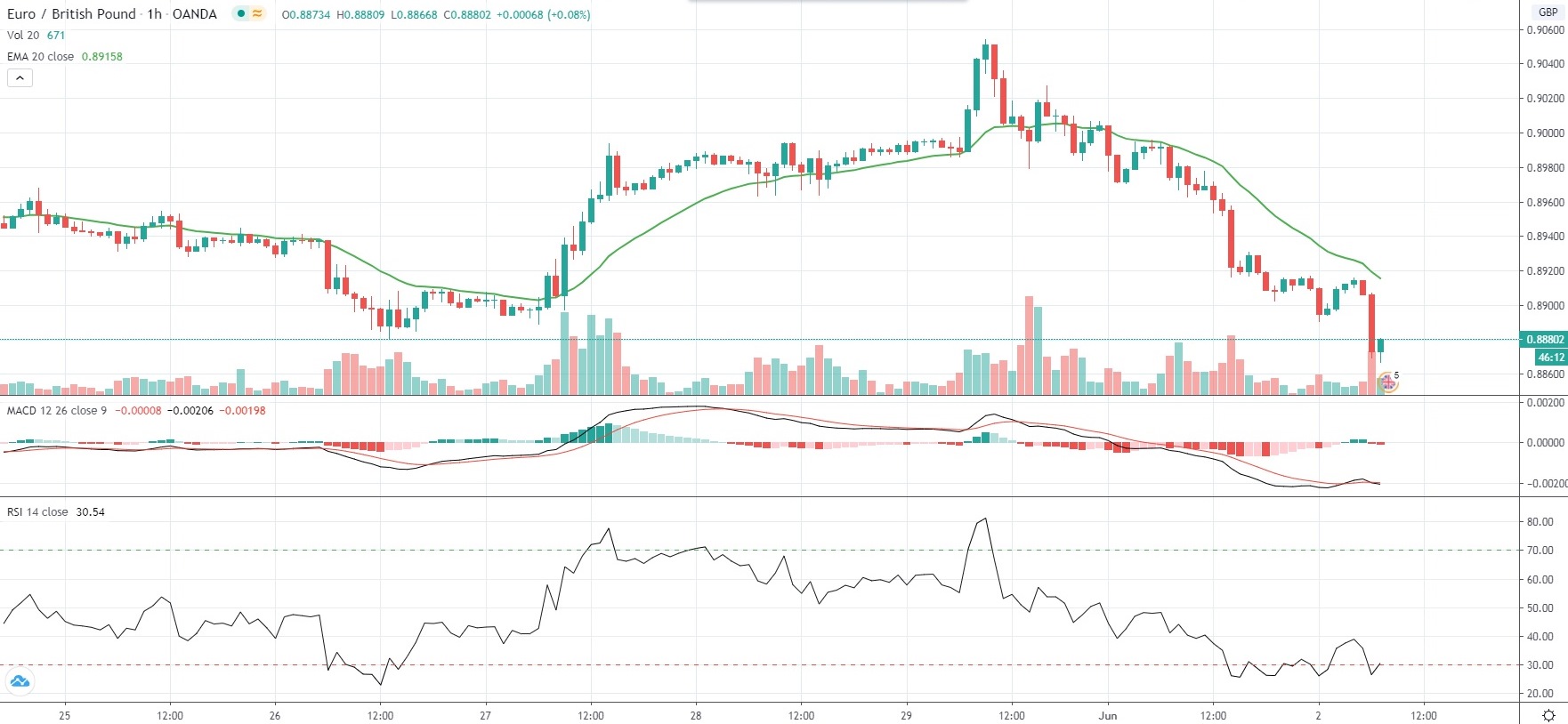 As of 7:14 GMT on Tuesday EUR/GBP was losing 0.42% to trade at 0.8877, after earlier touching an intraday low of 0.8867, or a level not seen since May 15th (0.8829).