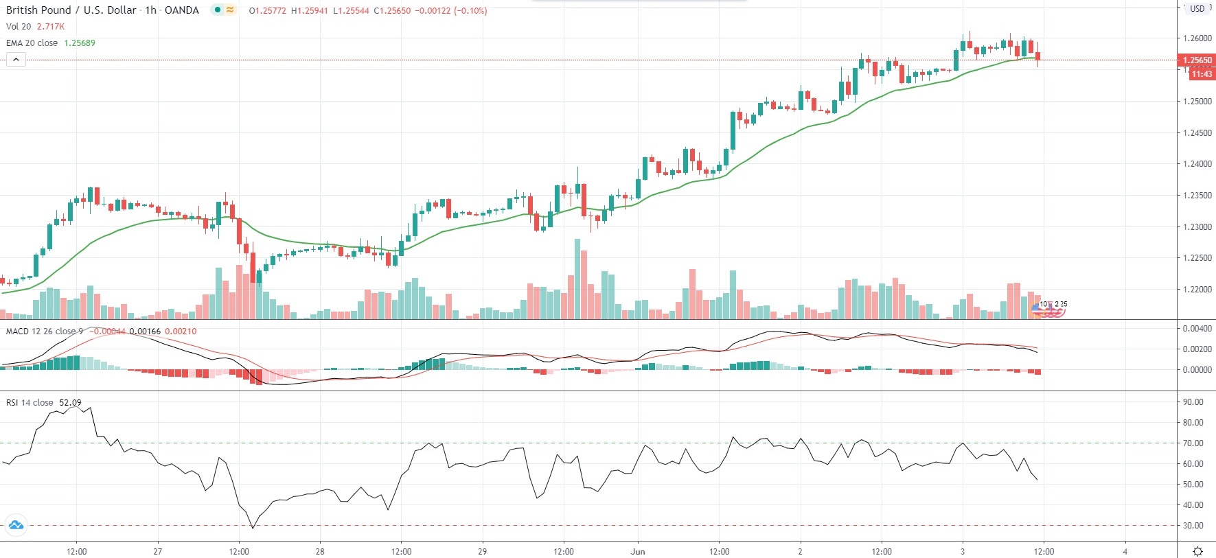 As of 11:50 GMT on Wednesday GBP/USD was edging up 0.15% to trade at 1.2570, after touching an intraday high of 1.2612 during early Asian trade, or a level not seen since April 30th (1.2644).