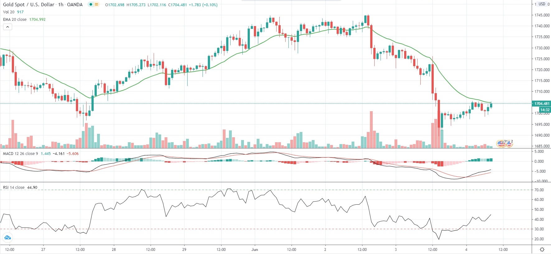 After sliding to lows unseen since May 7th on Wednesday due to economic recovery optimism-driven rally in global equities, Gold recouped a portion of losses on Thursday, climbing back above the $1,700 mark in a corrective move.
