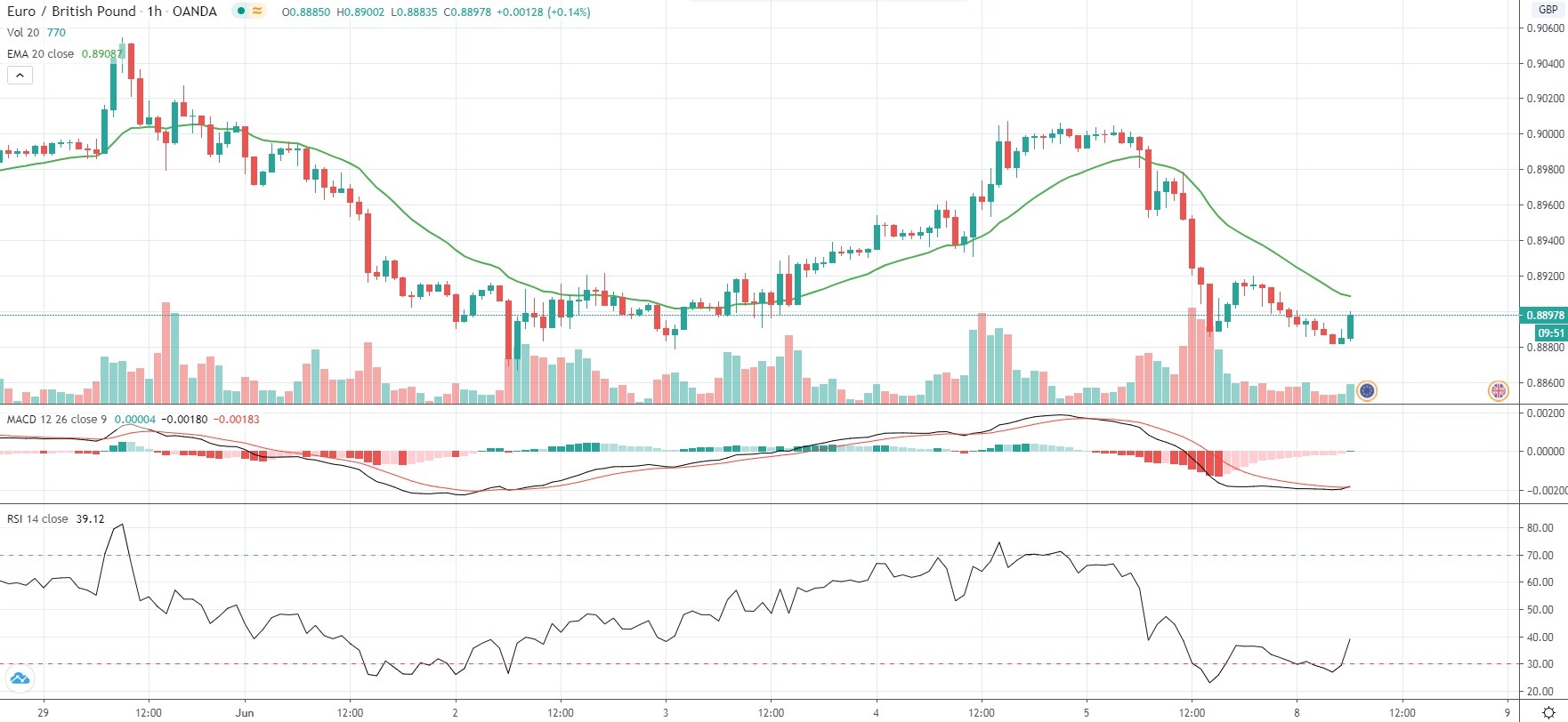 As of 6:50 GMT on Monday EUR/GBP was edging down 0.17% to trade at 0.8898, after touching an intraday low of 0.8882 during late Asian session, or a level not seen since June 3rd (0.8879).