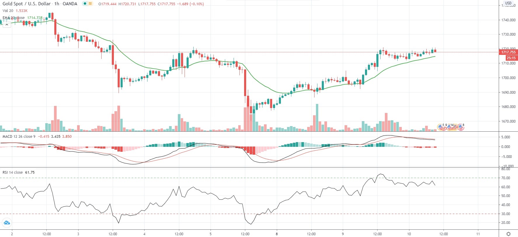 As of 9:30 GMT on Wednesday Spot Gold was gaining 0.23% to trade at $1,718.67 per troy ounce, after earlier touching an intraday high of $1,720.79, or a price level not far from June 9th high. Meanwhile, Gold futures for delivery in August were gaining 0.19% on the day to trade at $1,725.15 per troy ounce, while Silver futures for delivery in July were up 0.04% to trade at $17.802 per troy ounce.