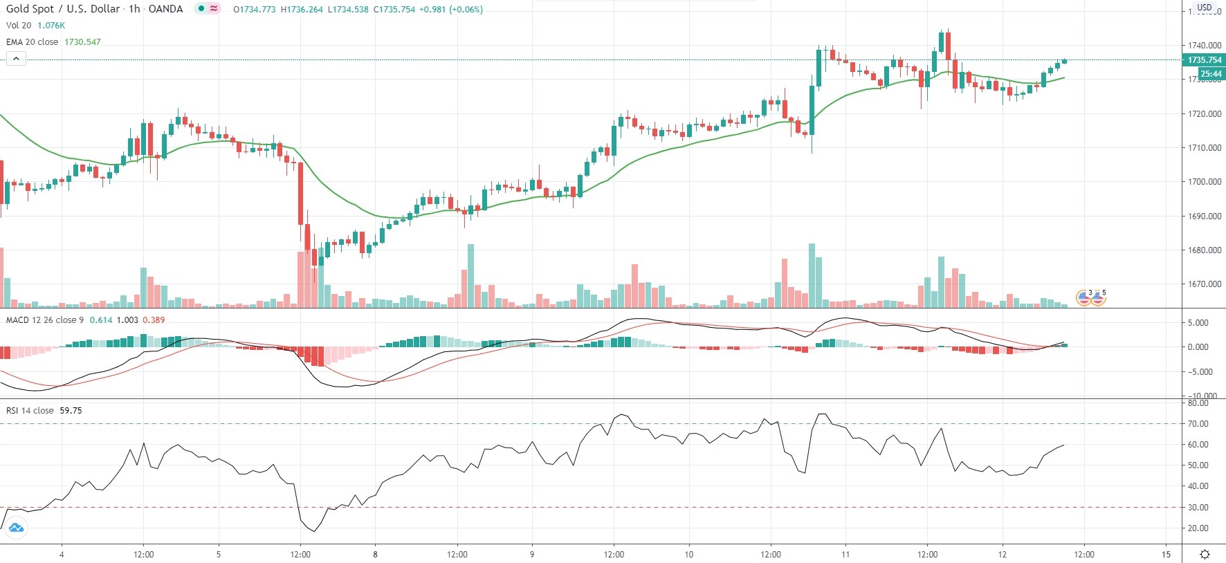 As of 9:35 GMT on Friday Spot Gold was gaining 0.49% to trade at $1,735.85 per troy ounce, after earlier touching an intraday high of $1,736.26, or a price level not far from Thursday’s more than one-week high. Meanwhile, Gold futures for delivery in August were gaining 0.12% on the day to trade at $1,741.90 per troy ounce, while Silver futures for delivery in July were down 0.69% to trade at $17.765 per troy ounce.