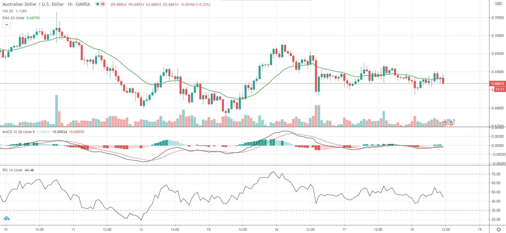 As of 11:46 GMT on Thursday AUD/USD was edging down 0.23% to trade at 0.6868, after touching an intraday low of 0.6837 in early Asian session, or a level not seen since June 16th (0.6834).